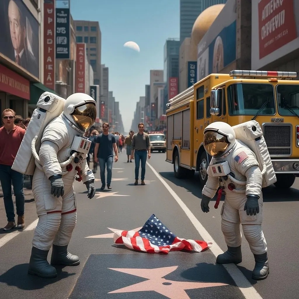 Перед вами стоит человек в громоздком скафандре, который сияет отражённым светом фонарей. Его шлем слегка запотевает от дыхания, создавая иллюзию реальности происходящего. Это не настоящий астронавт, а актёр, выполняющий свою роль перед объективами камер. Он медленно передвигается по лунному ландшафту, делая вид, будто исследует поверхность далёкого небесного тела.