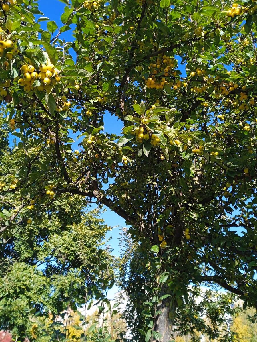 Всем привет. Второй день в городе стоит отличная погода, с самого утра светит солнце. На свою обычную прогулку я отправилась в ближайший парк. Обычно в парк иду дворами, а во дворах около домов растет много яблонь, и я вижу, на них висят красивые красные яблоки. Но висят они высоко, и их не достать. О коло одной из таких яблонь стоял молодой мужчина и длинной палкой сбивал яблоки. Когда я подходила, он одно яблоко сбил, оно упало на асфальт, он его поднял, вытер об куртку и так смачно откусил, что аж сок из ябока брызнул. Мне стало смешно, и я спросила: - Вкусно? - Очень. И достал пару яблок из пакета и стал меня угощать. Я отказалась. 😅 Не бомж какой-то, а прилично одетый кавказец, и борода подстрижена в барбершопе. Я посмеялась и пошла в парк смотреть на яблоки. В парке больших яблок я не увидела, а увидела гроздьями висящие маленькие яблочки. Яблонь в парке много, и яблочек тоже. Никто их не срывает и не ест. Гуляла по парку, любовалась яблонями и грелась на солнышке, а в