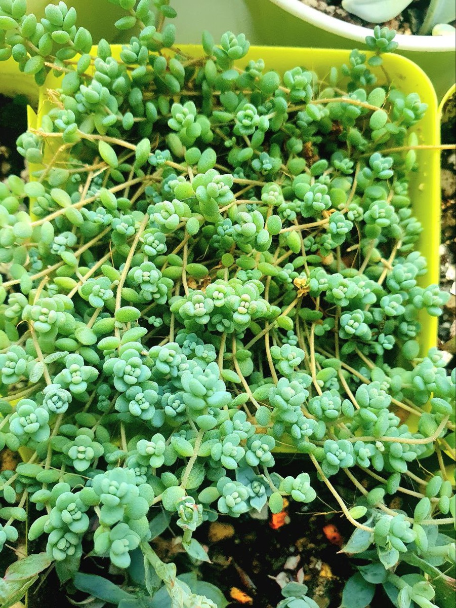 #седум Очень славный Седум - Густолистный 🪷 Весьма бодро и сочно растёт, вот только всё время норовит залезть в соседние горшочки и там укорениться 🧩 Видимо, придётся его отселять от собратьев и подвешивать отдельно 💚