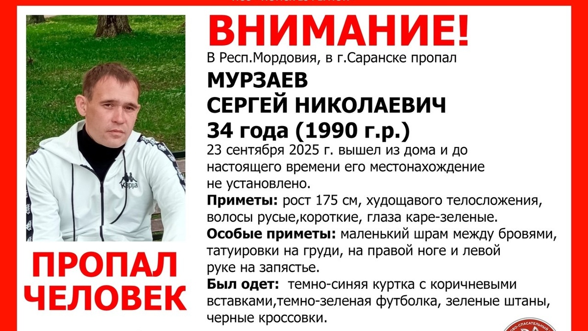 В Саранске пропал без вести 34-летний Сергей Мурзаев Молодого мужчину в столице Мордовии видели в последний раз 23 сентября #Мордовия #город13 #Саранск #розыск #волонтёры Город N13 | Саранск Читать на сайте: https://info-rm.com/lenta/societyru/v-saranske-propal-bez-vesti-34-letniy-sergey-murzaev-/