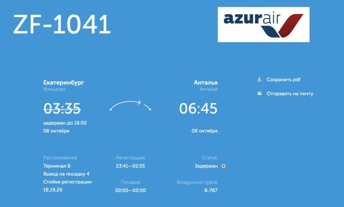 Рейс авиакомпании AZUR air из Екатеринбурга в Анталью задерживается более чем на 12 часов.