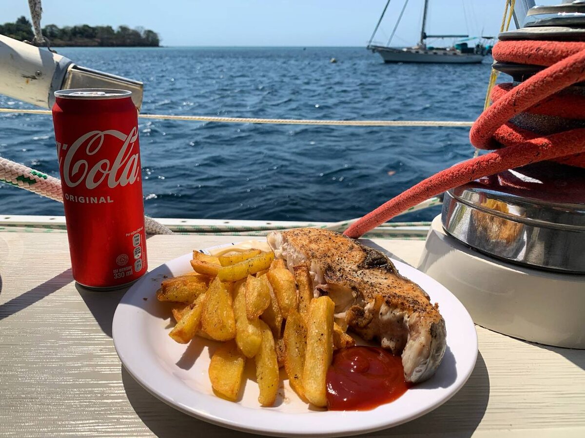 А у нас сегодня fish & chips — из громадной испанской макрели, которую выловили недавно