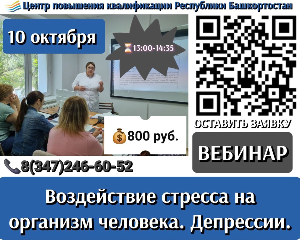 🔥Присоединяйтесь, будет интересно! 📅10 октября только для наших слушателей мы проведем вебинар, посвященный Всемирному дню психического здоровья «Воздействие стресса на организм человека. Депрессии». 🎓Целевая аудитория: специалисты со средним медицинским профессиональным образованием по специальности «Сестринское дело». 🕐Время проведения: 13:00 – 14:35 (по Уфимскому времени). 💻Онлайн трансляция будет организована на платформе «PRUFFME». Ссылка на трансляцию будет выслана в письме на электронную почту только для предварительно зарегистрированных слушателей. 📄Каждому участнику мы выдаем электронный сертификат. 💸Стоимость участия: 800 рублей. 📞Контактный телефон: 8(347)246-60-52. 📬Эл.почта: manager@medupk.ru ➡️Регистрация по ссылке: https://clck.ru/37rAK3?
