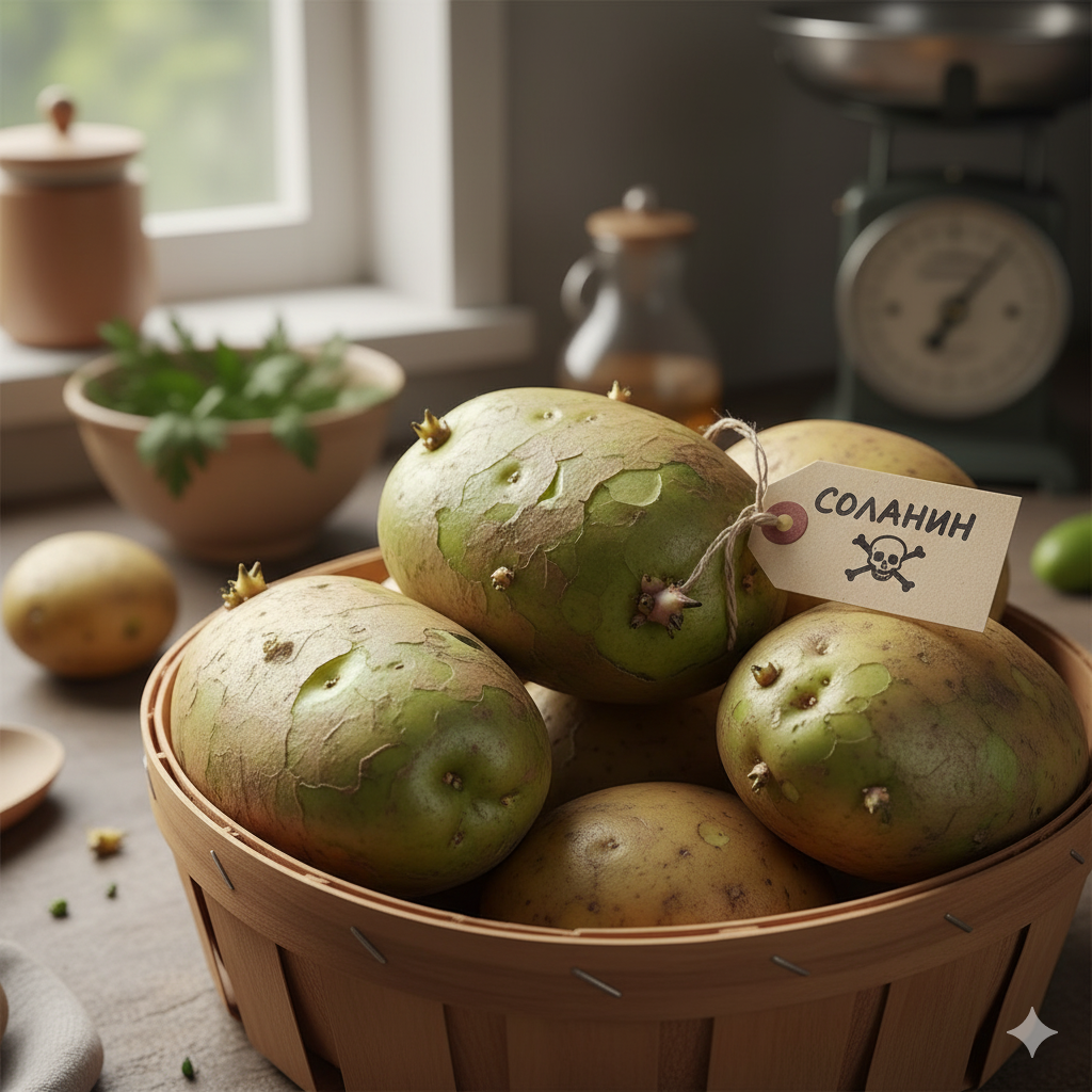 Интересный факт: в позеленевшем картофеле концентрация обычно значительно выше. Под воздействием света в клубнях вырабатывается хлорофилл - он сам по себе безвреден и лишь придает кожуре зеленый оттенок. Однако освещенность служит для растения сигналом опасности: клубень "понимает", что он вышел на поверхность, и включает защитные механизмы. В результате активируется синтез гликоалкалоидов: соланина и чаконина, которые действуют как природные инсектициды и фунгициды. Именно эти вещества, а не зеленый пигмент, делают позеленевший картофель потенциально токсичным для человека.