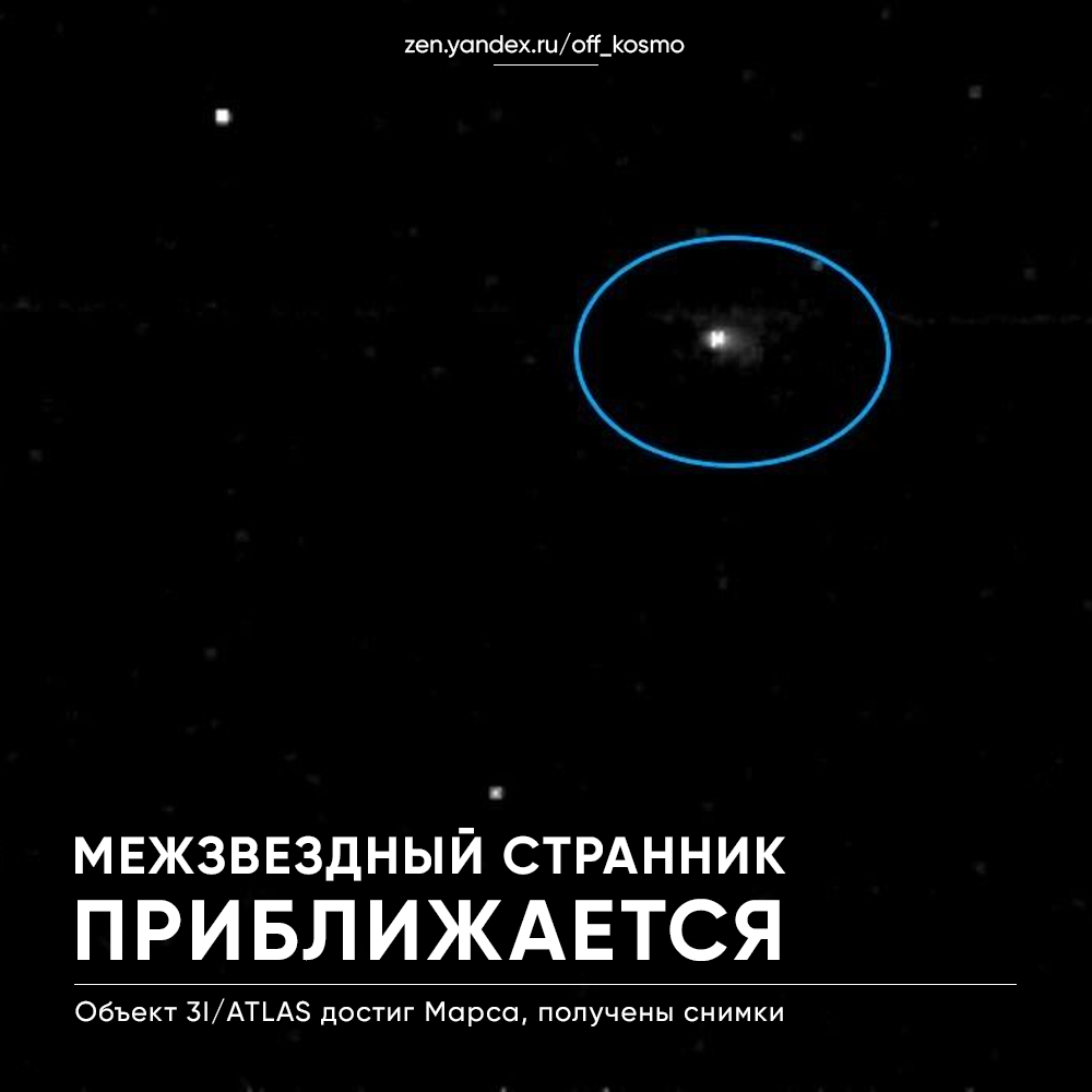 Вот уже несколько месяцев межзвездный объект 3I/ATLAS, самый крупный и самый быстрый из всех известных небесных тел своего класса, пересекает Солнечную Систему. Несколько дней назад он достиг области наибольшего сближения с Марсом, пройдя на расстоянии около 30 млн км от него. С 1 по 7 октября космические аппараты ExoMars TGO и Mars Express наблюдали за космическим странником. Чтобы получить изображение столь малого и тусклого небесного тела, пришлось использовать съемку с продолжительной выдержкой. Из-за этого на некоторых фото объект выглядит вытянутым, однако, это всего лишь иллюзия. Подобный оптический эффект возникает, например, при съемках ночного неба. К сожалению, из-за большого расстояния и малых размеров цели, невозможно заметить на снимках отдельные детали строения межзвездной кометы, например, отделить ее ядро от комы – облака газа и пыли, окружающего ядро. Позже, когда 3I/ATLAS приблизится к Солнцу, стоит ожидать появления видимого «хвоста». Его изучение позволит лучше пон