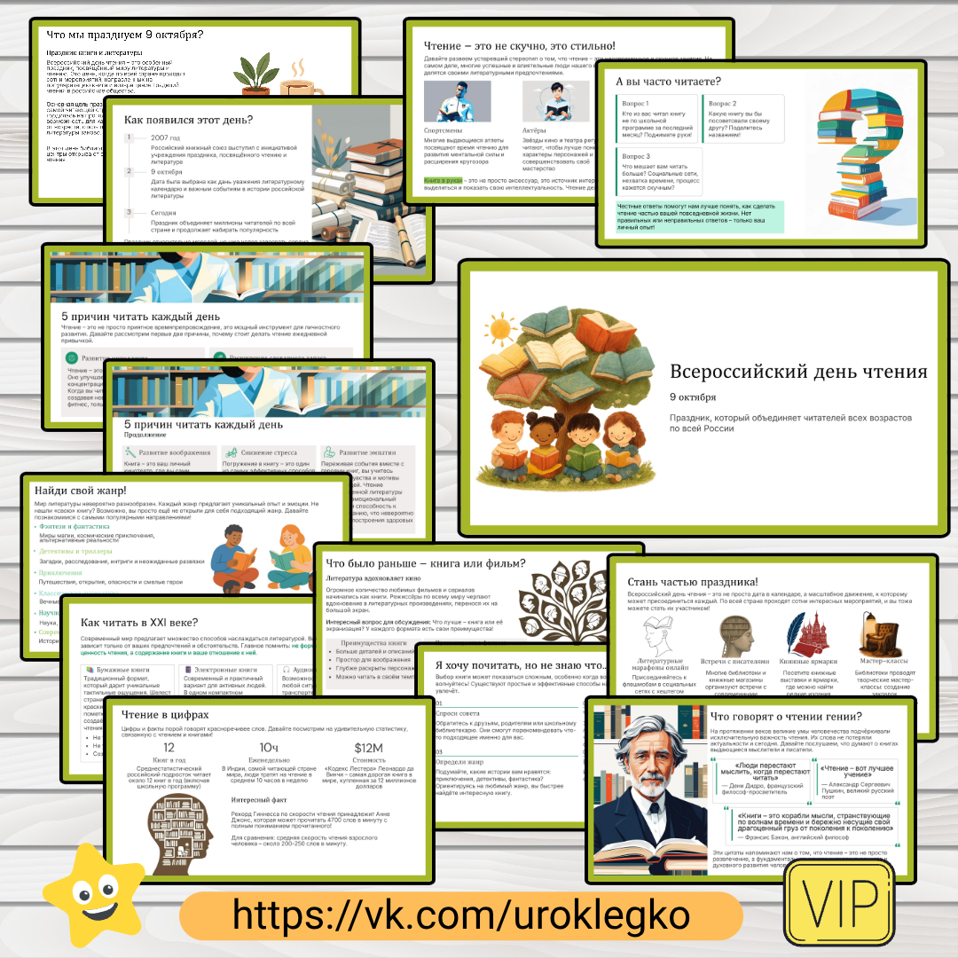 Данная презентация, посвящённая Всероссийскому дню чтения, понадобится для того, чтобы в увлекательной и интерактивной форме рассказать школьникам об истории и цели этого праздника, развеять миф о чтении как о скучном занятии и показать его актуальность и престиж в современном мире. Она поможет мотивировать учащихся читать регулярно, приведя убедительные причины пользы чтения, познакомит с разнообразием литературных жанров и современных форматов книг, а также предложит практические решения дл