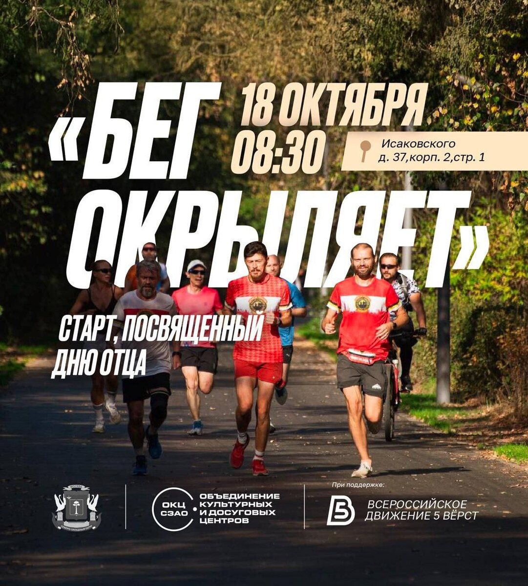 Старт, посвященный Дню Отца "Бег окрыляет". Тема: Обнови рекорд трассы 🙂 Организатором выступает Префектура СЗАО г. Москвы и ГБУ г. Москвы "ОКЦ СЗАО". Мероприятие проводится при поддержке Всероссийского движения 5 вёрст. 🗓 Дата: 18.10.2025г. ⏱️ Время: 8:30 Место проведения: г. Москва, ул.Исаковского, д.37, к.2, стр.1 📍точка старта: 55.805169:37.425709 👍 Возраст без ограничений 🤗 Участие бесплатное 🥁 Предстартовый сбор в 8:30 🤸🏻 Разминка в 8:35 🏃♂️ Старт в 9:00 Приглашаем БЫСТРЫХ БЕГУНОВ со всей Москвы попробовать себя у нас, на трассе 👏 Забег пройдет с участием пейсеров: 3:30, 4:00, 4:30, 5:00, 5:30, 6:00, 6:30, 7:00 После забега праздничная часть, медали и совместное чаепитие ➡️РЕГИСТРАЦИЯ ЗДЕСЬ #деньотца #бег #забег #старт #забегсзао #окцсзао