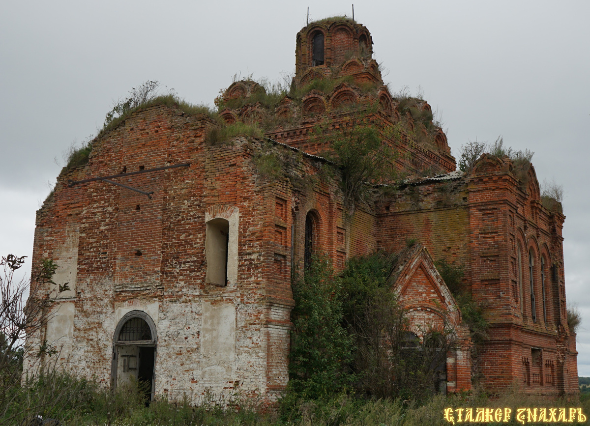 «Добраться до села тем более трудно, что оно незаметно даже вблизи, так как старинная полуразрушенная церковь едва возвышается над крестьянскими избами. Тем не менее церковь эта представляет большой интерес для археологов. По народному преданию церковь эта построена была царем Иоанном Васильевичем Грозным. Доказательством справедливости этого может служить, находящаяся и поныне на кресте этой церкви корона».
