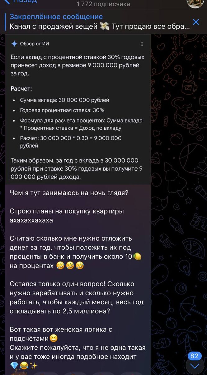 Как накопить на квартиру? Недавно на одном из каналов инстадивы наткнулся на такой интересный пост. Там она на ночь глядя считала, сколько же нужно ей откладывать, чтобы купить квартиру. Расчет довольно занимательный. Во-первых, где она нашла доходность по банковскому депозиту 30%? Запомните никогда депозит не будет выше ставки ЦБ. Баста. Точка. Во-вторых даже если доходность будет 30%, она не учла, что есть инфляция, которая будет удорожать ее квартиру минимум на ставку инфляции каждый год. А значит в финансовой модели надо закладывать показатель удорожания. Отсюда и срок повысится. Ну и в третьих, сразу видно, что человек не владеет финансовой грамотностью и не знает, как использовать ипотечное плечо. Грамотный инвестор бы купил 2 квартиры, одна оплачивала бы ипотеки обеих, во второй живем. Хотите научиться разбираться в этом? Использовать инструменты инвестирования, купить свою квартиру уже в этом году, а может и не одну - совсем скоро я проведу мастер-класс разбор. Переходит