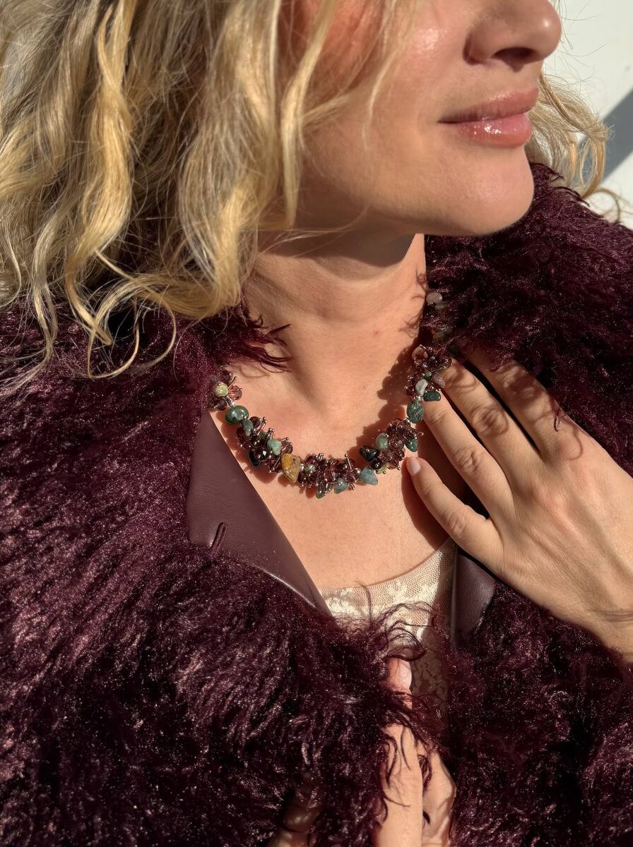 Сложные, насыщенные оттенки винного и изумрудного в калейдоскопе камней фактурного колье из натуральной яшмы
