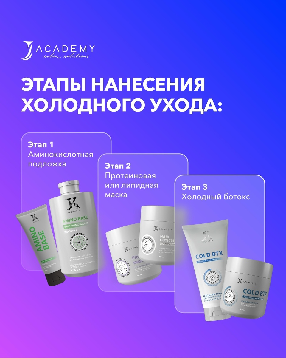 Холодный ботокс для ламинирования и гладкости Cold BTX работает на поверхности волоса, питает и создаёт красивый визуал. - Отступайте от корней 3-5 см при нанесении продуктов на волосы, чтобы избежать эффекта жирных корней. - Выдерживайте на волосах состав столько времени, сколько указано в инструкции, чтобы результат был эффективным. #jacademy