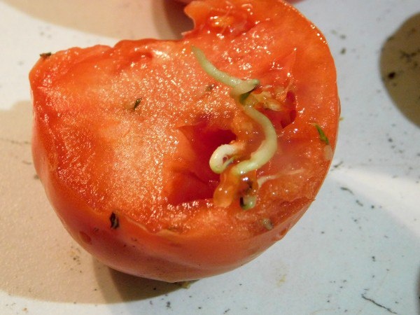 Помидоры живородки 🍅 Так бывает, что лежит себе помидор на кухне, а потом разрезаешь его, а внутри ростки. Чаще всего это тот самый помидор, что мы купили в супермаркете. 🍅 Что же с ним случилось? А все просто. Ехал он до супермаркета в холодильной камере, потом оказался в тепле нашей кухни. Для семян такой переход от охлаждения до тепла – сигнал для прорастания. 🍅 Собственно, есть такие помидоры можно, если раздражают проросшие семена, их просто убрать и использовать только мякоть. 🍅 Но и свои помидоры могут прорасти. Во-первых, если они перезрели ещё на корню и были собраны после холодных ночей. Во-вторых, если вы посадили сорта для длительного хранения. Помните, еще недавно томатные гуру расхваливали такие сорта, как Жираф или Новогодний. Вот они-то как раз и склонны к прорастанию семян. Да, их можно долго хранит, преимущественно в холодильнике, но как раз из-за холодильника вкус у них портится, а если оставить в ящиках в тепле, то начнут прорастать семена.