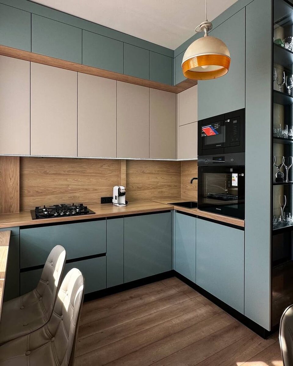 😍 Потрясающая кухня от «ДК Мебель» 🫶🏻 Детали проекта: 🔵 Фасады: · AGT 3019 Sahara · AGT 3015 Makaron green · Z-1 браш чёрный (стекло Stopsol phoenix grey) 🔵 Корпус: Egger кашемир серый 🔵 Столешница: Гикори натуральный 🔵 Скиналь: Гикори натуральный «ДК Мебель» — создаём уют и комфорт для вашего дома! ❤️ 💬 Нравится этот проект? Напишите нам в WhatsApp: +7 995 500-94-61
