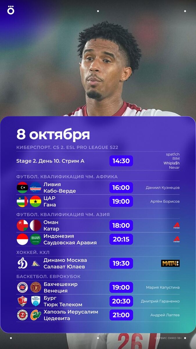 Квалификация ЧМ в Африке и Азии, КХЛ, киберспорт и много баскетбола. Насыщенная среда в Okko 😄