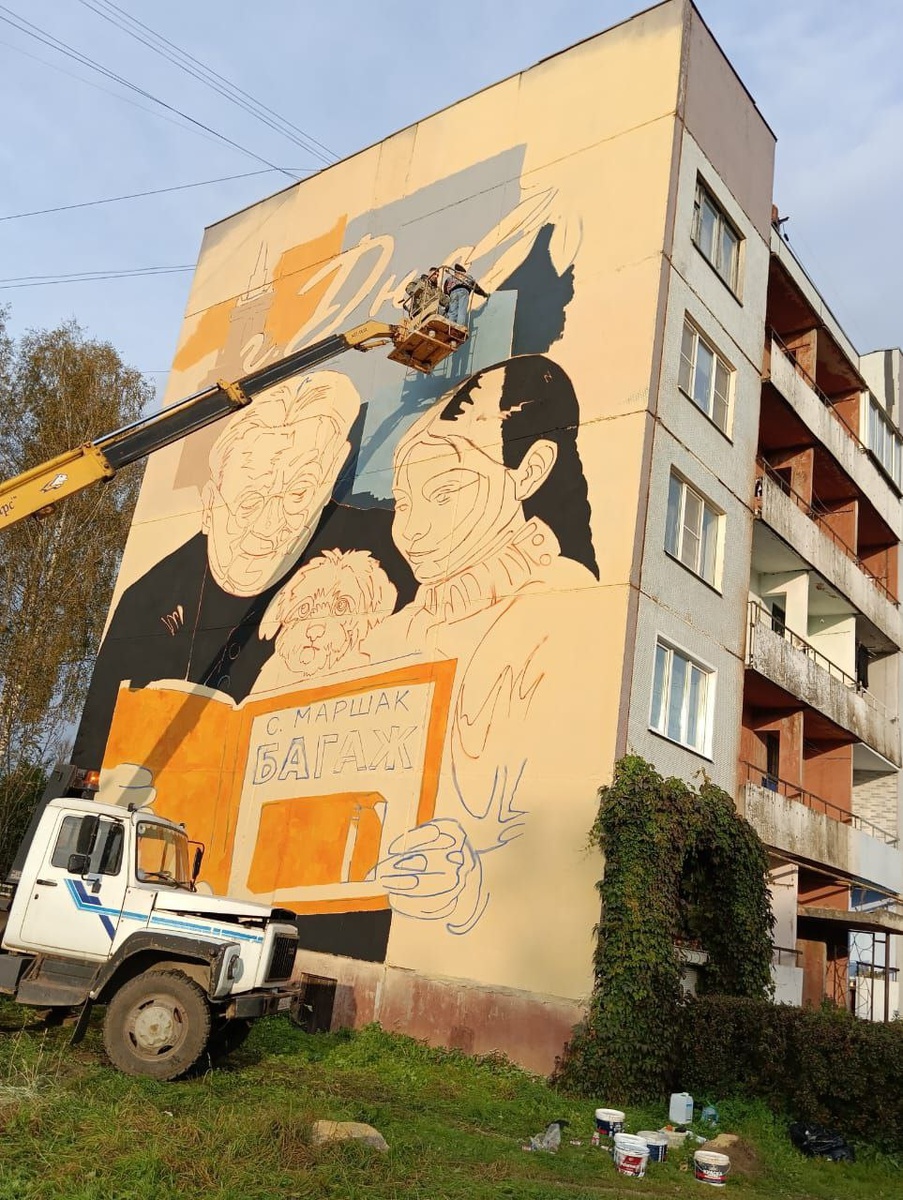 Мурал, посвященный поэту Самуилу Маршаку, рисуют на доме №12 на улице Дзержинского в Дно