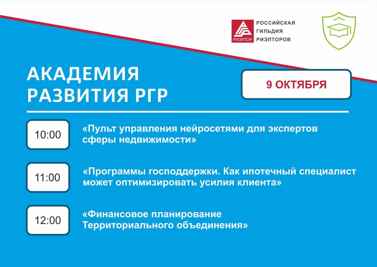 👨🎓 9 октября с 10:00 (мск) пройдут вебинары от Академии развития РГР и Каталога партнеров по образовательной деятельности РГР. 10:00 – Вебинар от нового партнера по образовательной деятельности РГР: Титов Евгений Тема: «Пульт управления нейросетями для экспертов сферы недвижимости» Каталог партнеров по образовательной деятельности 11:00 – Вебинар: «Программы господдержки. Как ипотечный специалист может оптимизировать усилия клиента» Факультет: «Ипотечный специалист» 12:00 – Вебинар: «Финансовое планирование Территориального объединения» Факультет: «Управление территориального объединения» Подробнее ⤵️ в расписании Присоединяйтесь к обучению, повышайте свой образовательный уровень и квалификацию сотрудников компаний! 🔔 Развивайся с РГР! 👨🎓 #академияРГР #каталогпартнëровРГР