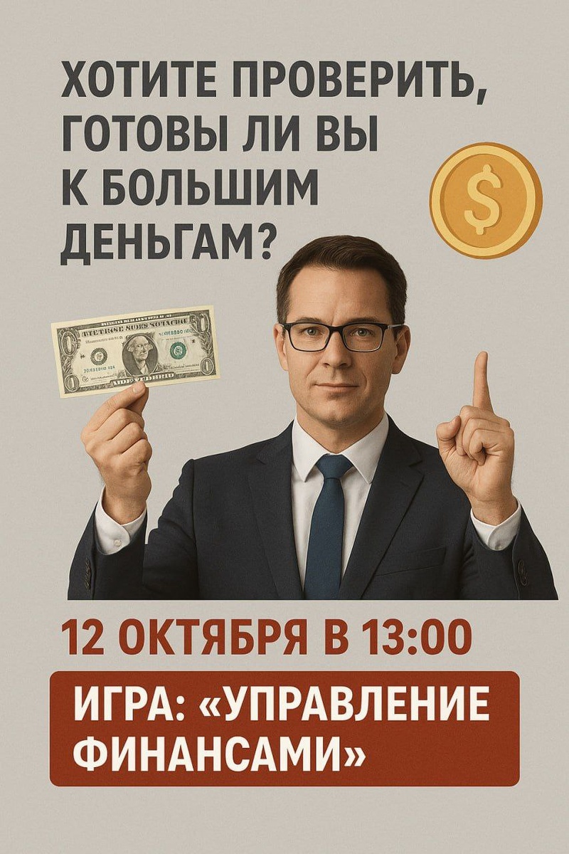 💰 Игра “Управление финансами”. Хотите проверить, готовы ли Вы к большим деньгам? В это воскресенье, 12 октября в 13:00, приглашаю Вас на трансформационную игру «Управление финансами» — это безопасное пространство, где можно увидеть, как Вы распоряжаетесь деньгами в жизни, всего лишь играя. 🔹 Узнаете, какая финансовая стратегия управляет Вами сейчас 🔹 Поймёте, где теряются возможности и прибыль 🔹 Получите инсайты, которые невозможно найти в книгах 🔹 Осознаете, что именно мешает выйти на новый уровень дохода Это не лекция и не тренинг — это игра, которая покажет Ваше отношение к деньгам и поможет скорректировать курс к финансовой свободе. 📍 Место: ТЦ Атриум, Навагинская 9д 🕐 Время: 12 октября, 13:00 💸 Стоимость 3000р 📲 Запись и вопросы: @mariachudinova174
