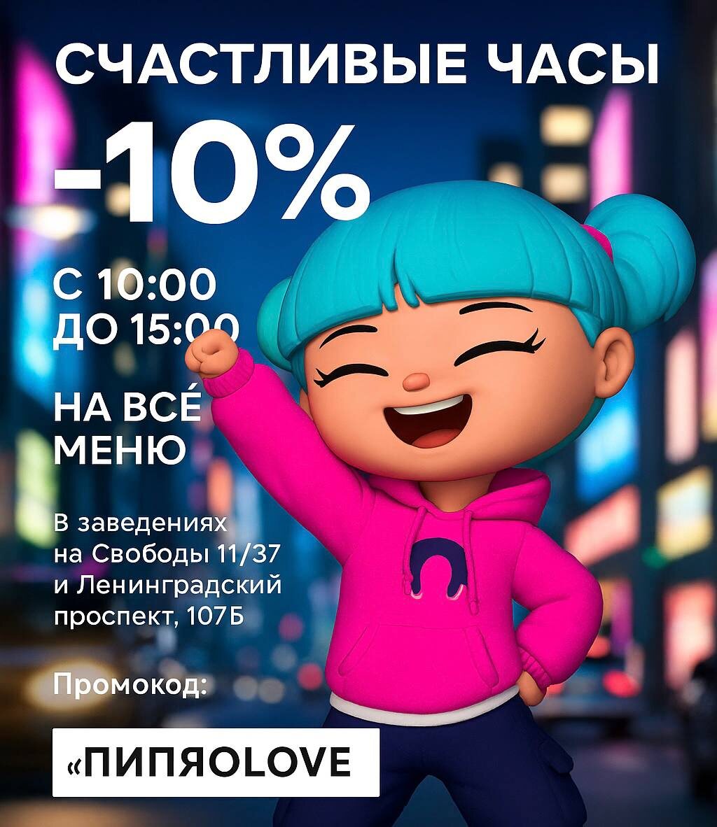 💥💥💥 СЧАСТЛИВЫЕ ЧАСЫ 💥 С 10:00 до 15:00 скидка –10% на всё меню 📌 В заведениях на Свободы 11/37 и Ленинградский проспект, 107Б 🔑 Промокод: «ПИПЯО LOVE» 📆 Действует 8, 9 и 10 октября — лови момент!
