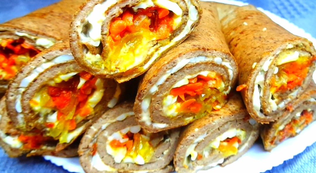 - Печёночный блин смазать яйцом с майонезом, на край блина выложить немного лука с морковкой. Свернуть блин в рулет. Так сделать с каждым блинчиком.