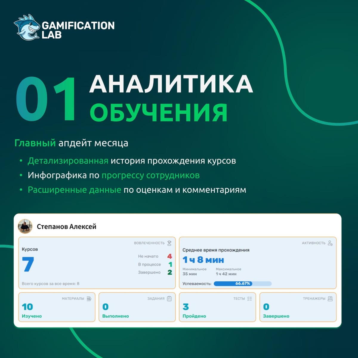 Обновления платформы В сентябре мы выпустили более 40 обновлений. Главный релиз месяца — аналитика обучения: теперь в разделе «Обучение» появились инфографика, детализированная история прохождений и оценки с комментариями Кроме того, мы обновили диалоговый тренажер, переделали дизайн карточек в магазине, доработали профиль и кастомизацию, вернули возможность текстовых должностей, а также внесли десятки улучшений в задания, группы и интеграции Кратко о главном рассказали в карточках. Полный список обновлений читайте на сайте → gamificationlab.com/blog/sept Остались вопросы или есть идеи? Пишите в бот поддержки @GamificationlabBot