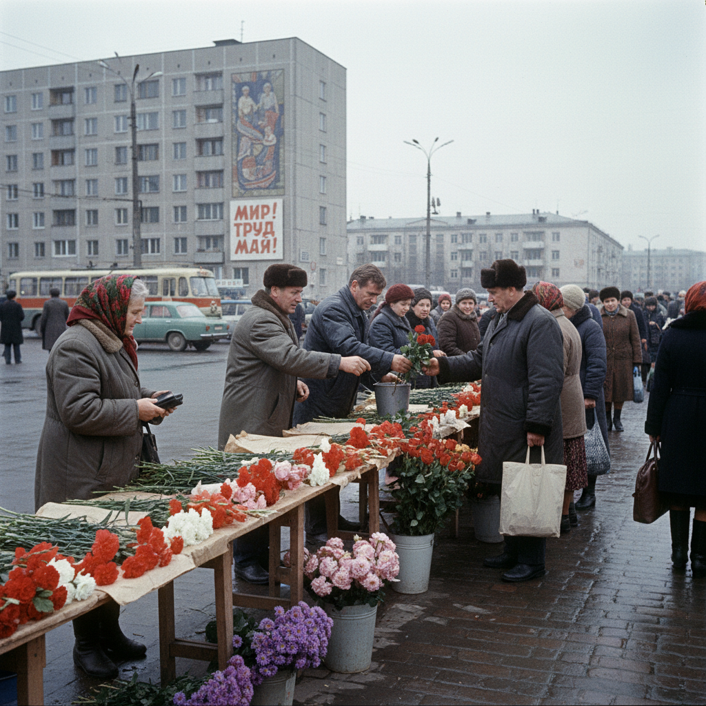 Цветочный бизнес в СССР был настоящей загадкой для современного покупателя. Как в условиях дефицита и строгого планирования можно было купить цветы в СССР? Представьте: очереди за тюльпанами на 8 Марта, ограниченный выбор роз и гвоздик, постоянное ощущение, что самый красивый букет уже купили до вас. В этой статье мы расскажем, как работал цветочный рынок в Советском Союзе, почему возник дефицит цветов, какие цветы дарили женщинам и какое социальное и культурное значение они имели. Цветочный рынок в Советском Союзе был сложным механизмом, объединявшим официальную торговлю и подпольные схемы. Государственное распределение товаров часто приводило к дефициту, что стимулировало спекуляции. Официальная продажа цветов происходила через государственные магазины и киоски. Там предлагались стандартные виды: розы, гвоздики, хризантемы. Ассортимент был ограничен, а цены — централизованными. Часто цветов на всех желающих не хватало, и купить цветы в СССР было настоящей задачей. Спекуляция возникал