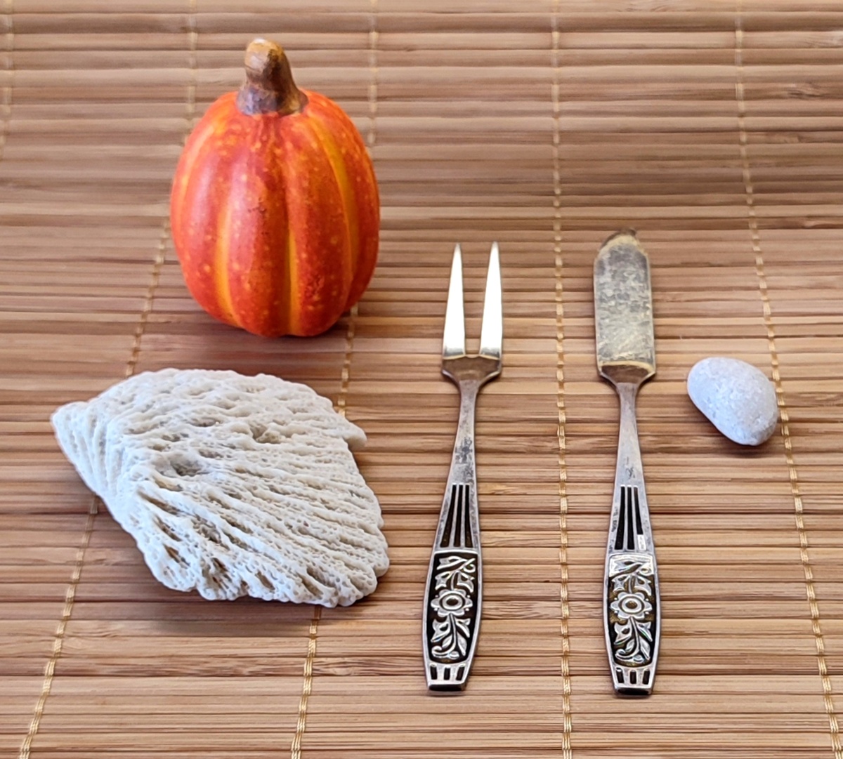 Вилка двузубая для закусок и нож для масла. Типа, набор для бутерброда. В полном наборе еще и чайная ложечка есть. Художественность этих предметов повышенная, потому что черное, это не патина, это эмаль! Сколы эмали не дадут соврать 😄