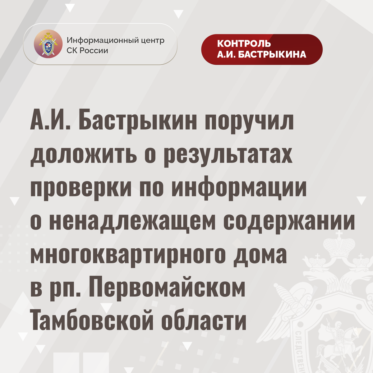 А.И. Бастрыкин поручил доложить о результатах проверки по информации о ненадлежащем содержании многоквартирного дома в рп. Первомайском Тамбовской области В сети Интернет сообщается о ненадлежащем содержании многоквартирного дома в рабочем поселке Первомайском Тамбовской области. Более трех лет в здании 1965 года постройки подвальные помещения регулярно затапливаются канализационными стоками и ливневыми водами, что может привести к разрушению несущих конструкций. Многочисленные обращения граждан в профильные структуры результатов не принесли. В СУ СК России по Тамбовской области организована процессуальная проверка. Председатель Следственного комитета Российской Федерации Александр Иванович Бастрыкин поручил и.о. руководителя СУ СК России по Тамбовской области Андрею Николаевичу Чапанову доложить о промежуточных результатах процессуальной проверки и принятом по итогам решении. Исполнение поручения, а также ход процессуальной проверки поставлены на контроль в центральном аппарате ведом