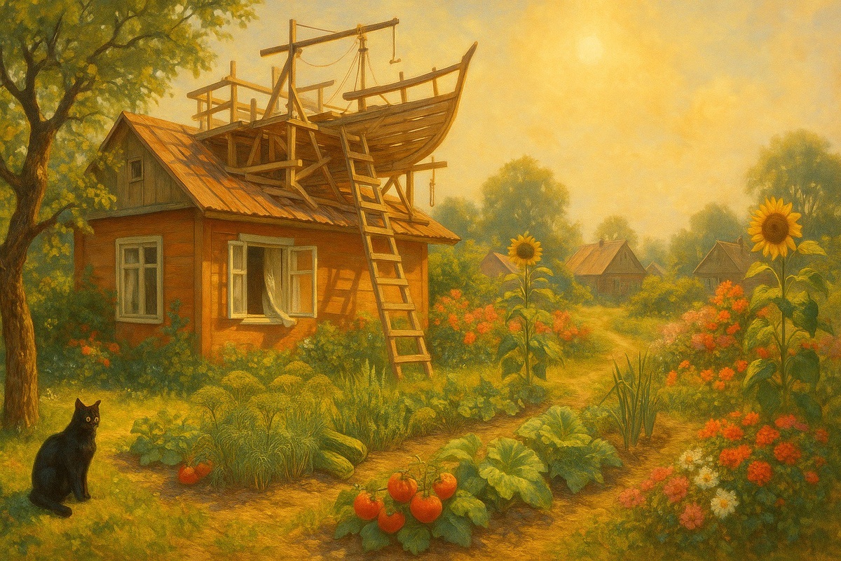 Лето в ЗемлеТочечном достигло зенита ☀️ — трава уже не росла, а дышала, 🌿🌿🌿 воздух стоял, как прозрачный мёд, 🍯 и даже время будто замедляло ход, чтобы не расплескать свет. Всё вокруг налилось зрелостью — кабачки доросли до философской толщины, а малина дозрела до состояния, когда её нельзя было есть, не вспоминая что-то хорошее. 🥴 Утро началось, как всегда, с шелеста метлы. 🧹 Вера Павловна ещё до шести вышла на веранду — сметать с досок ночную росу. 💦 — Вера Павловна, вы бы хоть немного отдохнули, — донёсся из окна сонный голос Клавдии. Какой там сон: у хозяйки в саду всё стояло по уставу. Огород — строем, клумбы — по ротам. Огурцы лежали рядами, 🥒🥒🥒 как на смотру; томатные кисти 🍅🍅🍅 — при полной готовности, без самодеятельности. По цветочным «батальонам» шла тихая перекличка: флоксы, 🌸 клематисы, 🌺 лилии, 🌸 дельфиниумы, 🌸 эхинацея, 🌸 астильба, 🌸 монарда, 🌸 хосты, герани, 💐 бархатцы 🌺 — от простых до вычурных, все на своих позициях. 😊 В тени сушились ломти
