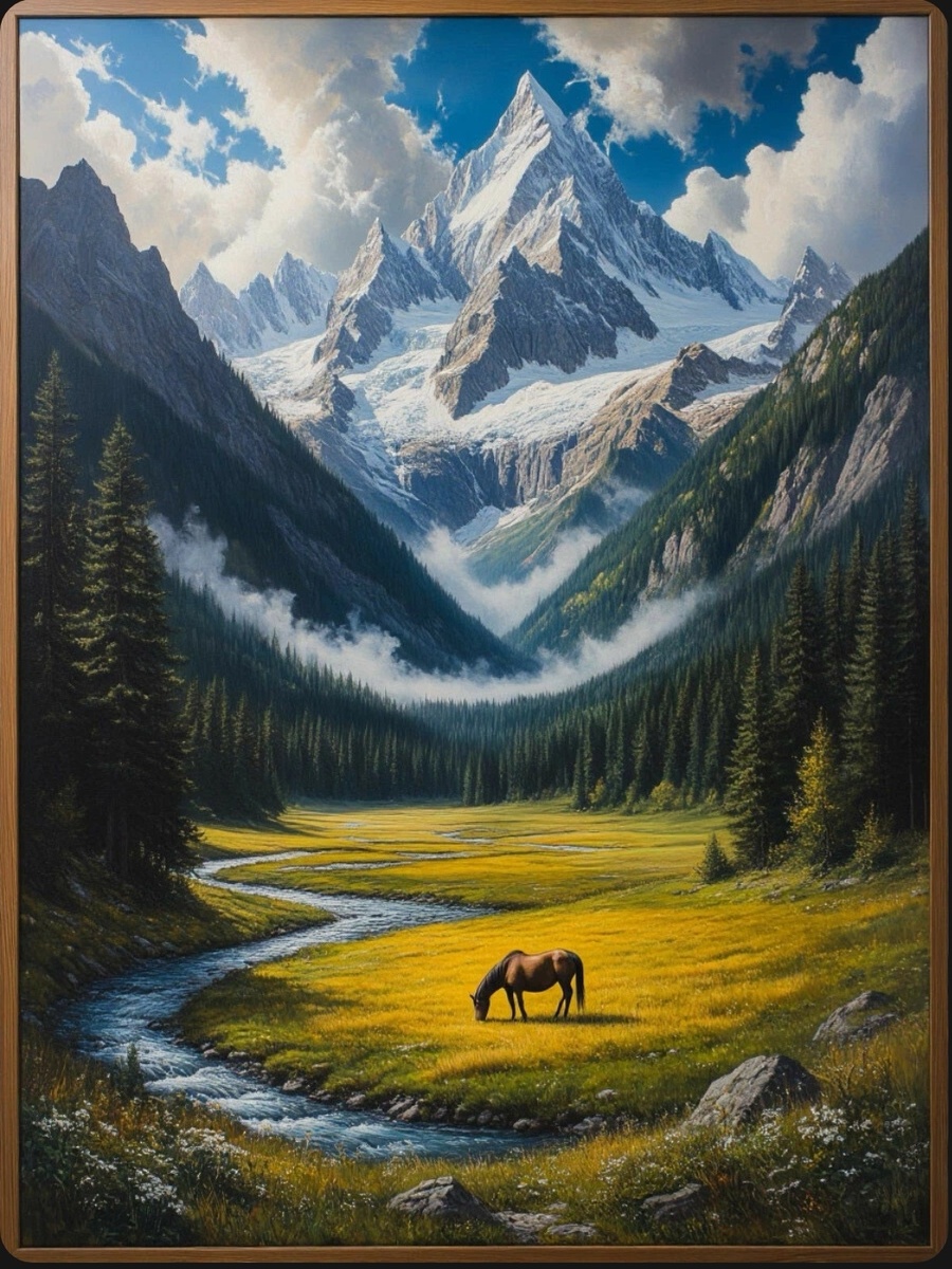 Он отнес холст к люку, в полосу света, падающую из окна мансарды. Да, тот самый. Горы на заднем плане, застывшие великаны. По бокам — густой, темный лес. Внизу, серебряной змейкой, извивалась речка. А в центре — солнечное поле, где паслась одинокая лошадь, золотистая на изумрудной траве.