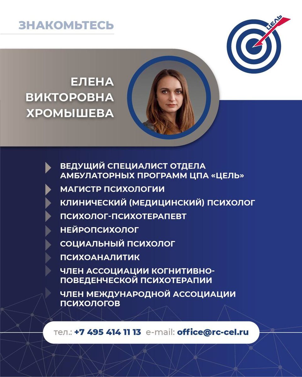 Дорогие подписчики, Сегодня мы хотим познакомить вас с нашем Клиническим психологом-психотерапевтом — Хромышевой Еленой Викторовной. Елена Викторовна — высококвалифицированный специалист с глубокими знаниями и богатым опытом работы в области клинической психологии, психотерапии и нейропсихологии. В нашей команде она занимает должность Ведущего специалиста отдела амбулаторных программ и вносит значительный вклад в развитие методов терапии и реабилитации наших клиентов. Как Ведущий специалист отдела амбулаторных программ, Елена Викторовна активно занимается разработкой и внедрением программ, направленных на поддержку и реабилитацию клиентов в амбулаторных условиях. Она работает над созданием уникальных терапевтических программ, которые учитывают индивидуальные потребности и особенности каждого человека. Елена Викторовна обладает эмпатичностью, профессионализмом и умеет сострадать, что позволяет ей устанавливать глубокие и доверительные отношения с клиентами. Она создает безопасную и