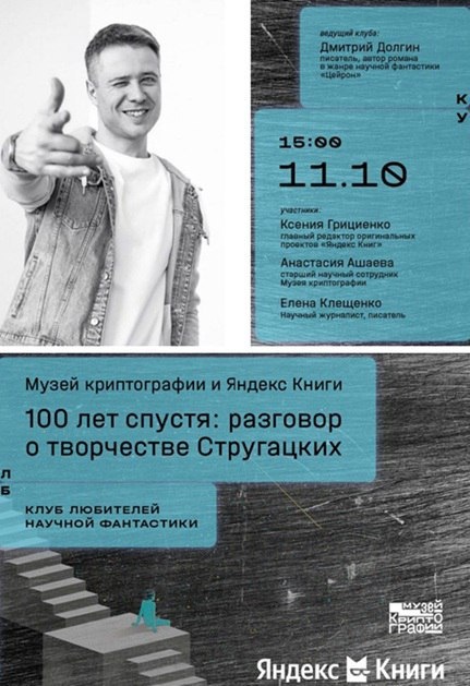 Друзья! Спешим поделиться с вами одной интересной новостью. 11.10.2025 в Москве стартует Клуб любителей научной фантастики. Вместе с авторами, учеными, редакторами и другими гостями Клуба участники исследуют, как антиутопия и научная фантастика дополняют друг друга, отражая тревоги, надежды и вызовы нашего времени, а также анализируют, как книги вдохновляют и формируют наше понимание мира и его будущего. На первой встрече, организованной совместно с «Яндекс Книгами», обсудим творчество братьев Стругацких — в честь 100-летия Аркадия Стругацкого, а также поговорим о современных трендах в сфере научной фантастики, о том, почему сегодня столько внимания приковано к этому жанру и как наша действительность буквально заставляет нас выбирать именно его. Спикеры: Ксения Грициенко, главный редактор оригинальных проектов «Яндекс Книг», куратор проекта о научной фантастике «Станция: Будущее». Анастасия Ашаева, кандидат исторических наук, старший научный сотрудник Музея криптографии. Елена Кл
