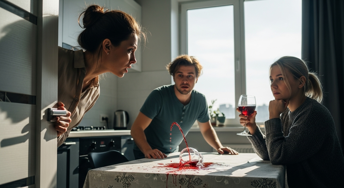 — Наташа! Ты... ты уже здесь! — его лицо приобрело тот самый оттенок, что и разлитое вино.