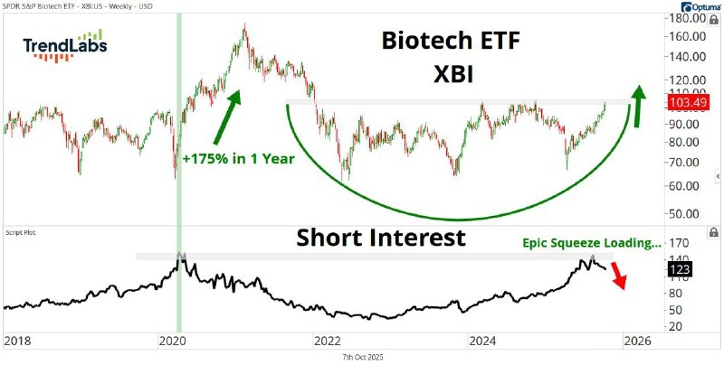 Одним из суб-секторов в здравоохранении является биотех- пожалуй, самый рискованный из всех. Поэтому сегодня хочу поделиться крайне интересным графиком XBI- одного из наиболее ликвидных ETF на акции биотехнологических компаний.
