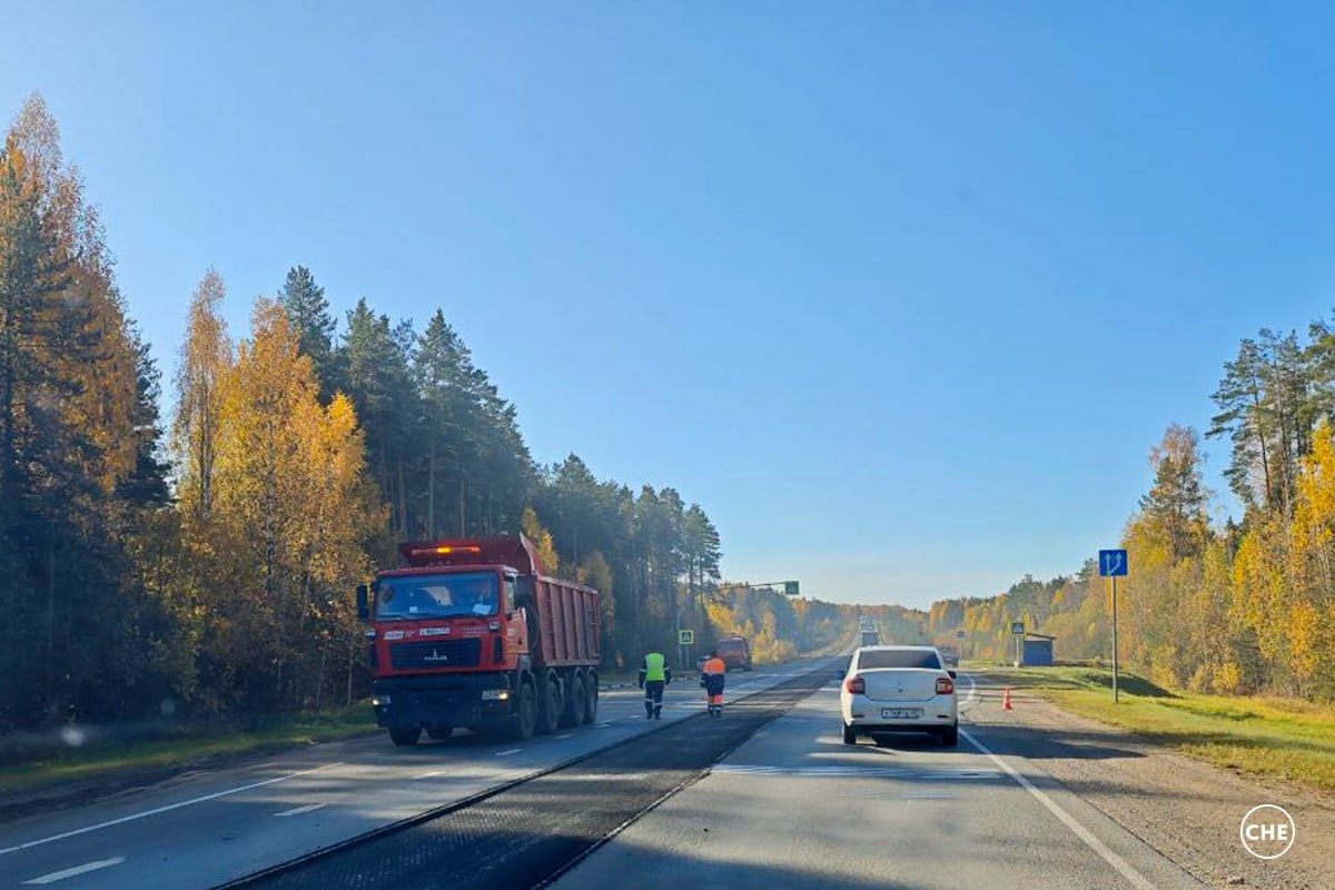 На кировской дороге в районе Харламовского переезда проходит асфальтирование