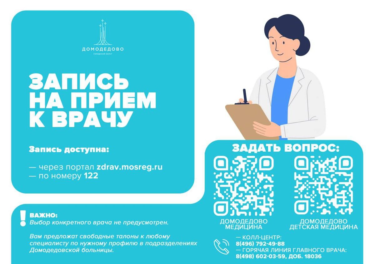 🥼 Как записаться на приём к врачу в Домодедовскую больницу? Для удобства пациентов доступны несколько простых способов: - через портал zdrav.mosreg.ru (https://zdrav.mosreg.ru/) - по телефону 122 Важно понимать, что выбор конкретного врача не предусмотрен. Вам будут предложены свободные талончики к специалистам по нужному профилю в подразделениях больницы. Есть вопросы по здравоохранению? Задайте их удобным вам способом. В Телеграм: - чат по вопросам медпомощи для взрослых: https://t.me/+Ofso9C-UktNjYWNi. - чат по вопросам детской медицины: https://t.me/+CtAl-fJZ13FhMDZi. А также по телефону: - колл-центр: 8(496) 792-49-88 - горячая линия главного врача: 8(498) 602-03-59, доб. 18036 Заботьтесь о своем здоровье! 📱 Евгения Хрусталева | Глава Домодедово