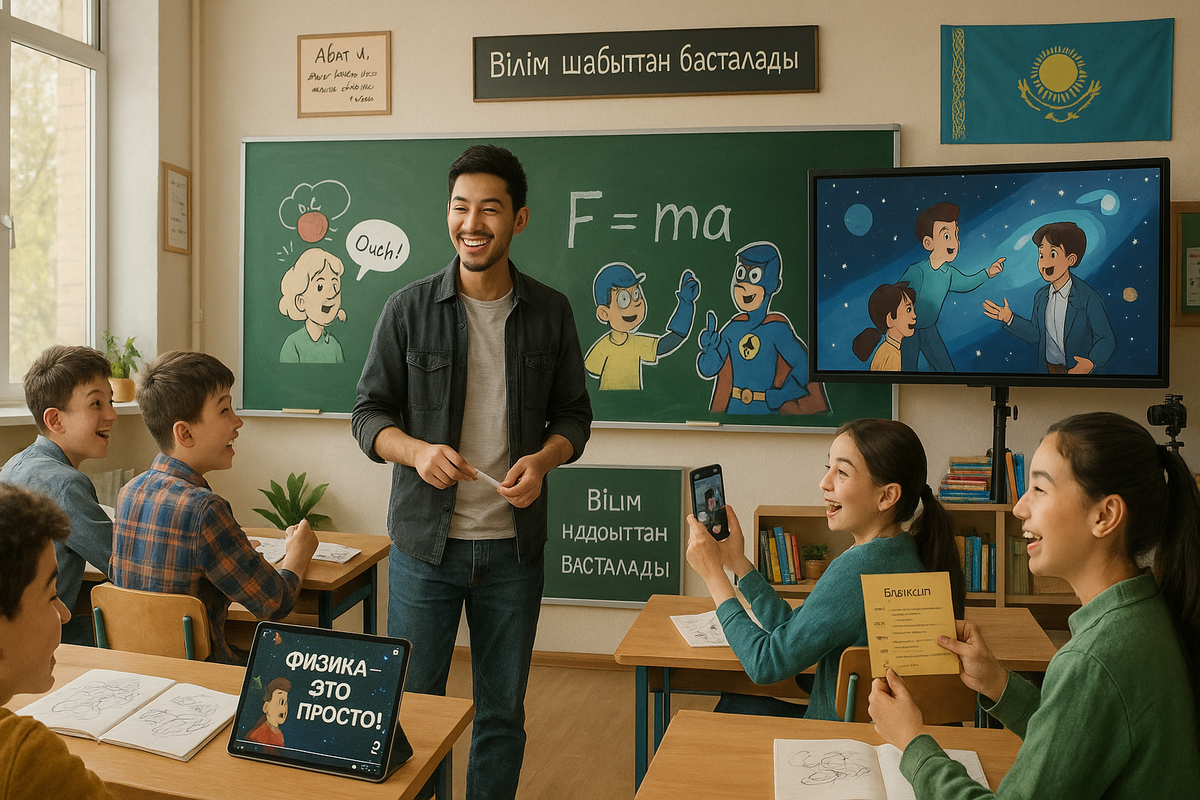26-летний физик Жаскайрат Наубетов — пример того, как традиционный предмет можно превратить в живую историю. Его путь начался в 2020 году, когда карантин заставил тысячи педагогов перейти в онлайн. Стандартные лекции не работали, и тогда Наубетов стал использовать мемы и шутки из TikTok, чтобы объяснять законы Ньютона. После снятия ограничений он продолжил эксперименты, включая в занятия элементы сторителлинга и комиксов. В его классах школьники сами рисуют сюжеты, где герои открывают физические законы, спорят, ошибаются и находят решения.