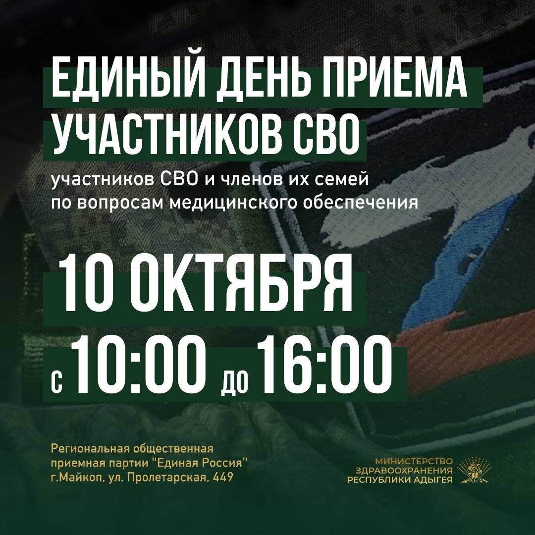 #Минздрав_01 #ЕдинаяРоссия #приём_граждан #СВО «Единая Россия» проведёт Единый день приёмов участников СВО и членов их семей 10 октября в Региональной общественной приёмной партии «Единая Россия» состоится приём участников СВО и членов их семей по вопросам медицинского обеспечения Как обратиться за помощью: 📞+7(8772)52-76-03 💻онлайн-обращение 📍г. Майкоп, ул.Пролетарская 449