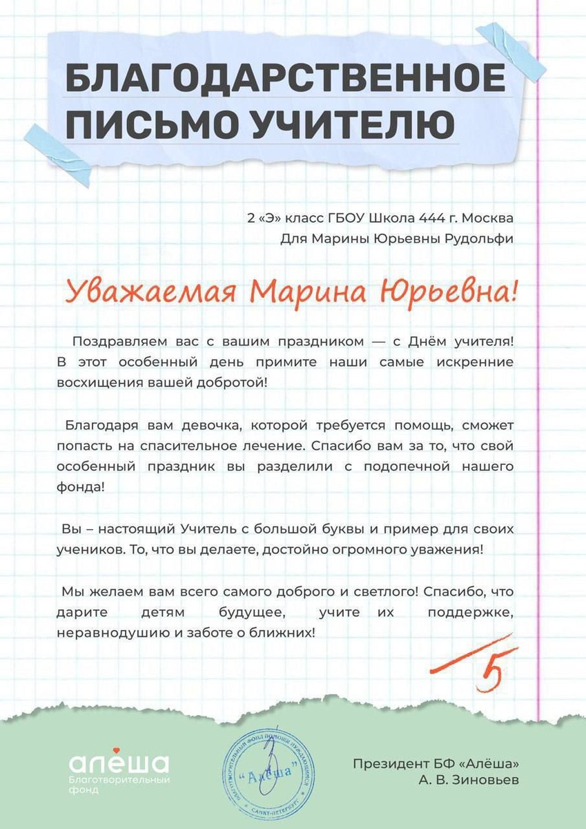 🤍Вместе мы сила! 2 «Э» снова в деле!🤍 ☺️ Наш дружный 2 «Э» класс снова принял участие в благотворительном сборе средств для фонда «АЛЁША». 🙏 2 «Э» классу уже удалось собрать значительную сумму. Спасибо классу за доброту и отзывчивость. В ответ на помощь Алена и её мама записали трогательное видео с благодарностью и отправили открытку ко Дню учителя. #Школа444Москва #ТриЧетверки #МРСД12 #ДОНМ #ШколыКолледжиМосквы