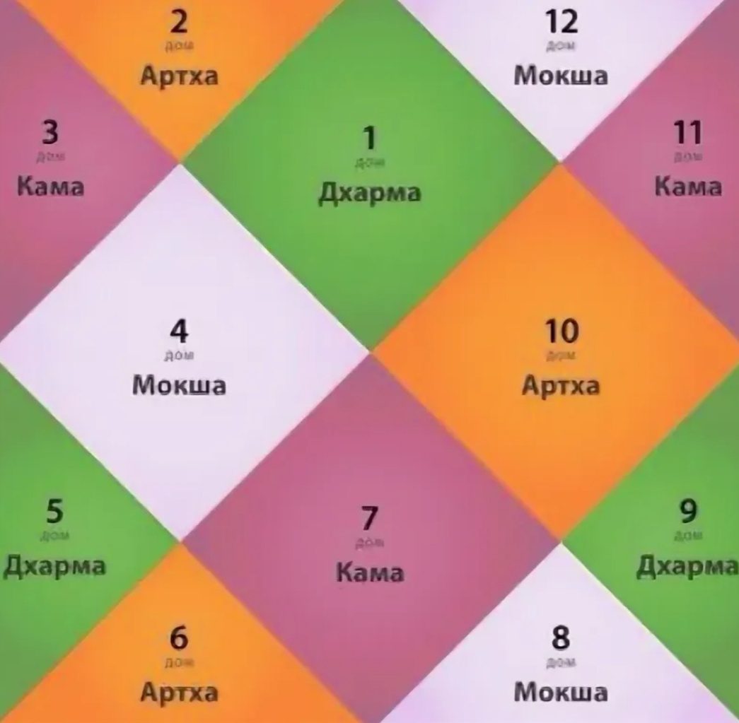 4-ре цели жизни Ведическая астрология выделяет 4-ре цели жизни, потому что именно 4-ка связывает жизнь с материальным проявлением, в соответствии с 4-мя стихиями 🔥ПОЗНАЙ СЕБЯ В естественном гороскопе 1,5,9 дома называются треугольником Дхармы и несут в себе идею огненных знаков: Овен, Лев, Стрелец. Дхарма - это естественный долг, связанный с проявлением врождённой природы. И самае важная обязанность - сохранить жизнь. А также познать возможности тела, понимать свой характер, освоить творческий/интеллектуальный потенциал и следовать своему особому пути, подавая пример "младшим". 💰ПРОЦВЕТАЙ 2,6,10 дома составляют треугольник Артхи и отвечают за финансовое благополучие, которое представлено зодиаком Тельца, Девы, Козерога. Земные знаки указывают на важность материальных вещей. От обретения необходимого ресурса для жизни до решения повседневных дел и социального проявленния, через работу или иную активность важную для других. 👩❤️👨НАСЛАЖДАЙСЯ Кама - это удовольствие, получаемое о