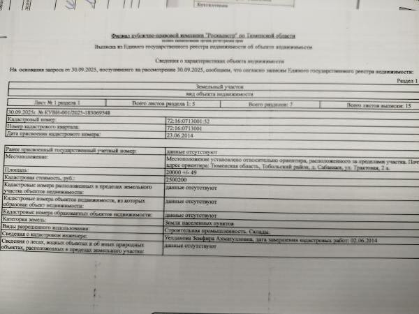 Название: Право на заключение договора аренды на земельный участок с кадастровым номером 72:16:0713001:52, расположенный по адресу: Тюменская область, Тобольский район, д.Сабанаки, ул. Трактовая, 2А Канал: Госземля Тюменская область Область: обл Тюменская Тобольский район Район: д.Сабанаки Населенный пункт: ул. Трактовая, 2А Локация: Смотреть на карте ВРИ: Строительная промышленность Кадастровый номер: 72:16:0713001:52 Кадастровая стоимость: 2500200.00 Вид сделки: Аренда Площадь: 20000 м² Начальная цена: 225018.00 руб. Дата завершения: 21.10.2025 Подробнее: ГИС ТОРГИ #госземля #земляотгосударства #земля #земельныйучасток #земельныеторги #торги #аукцион #арендаземли #аренда #тюменскаяобласть
