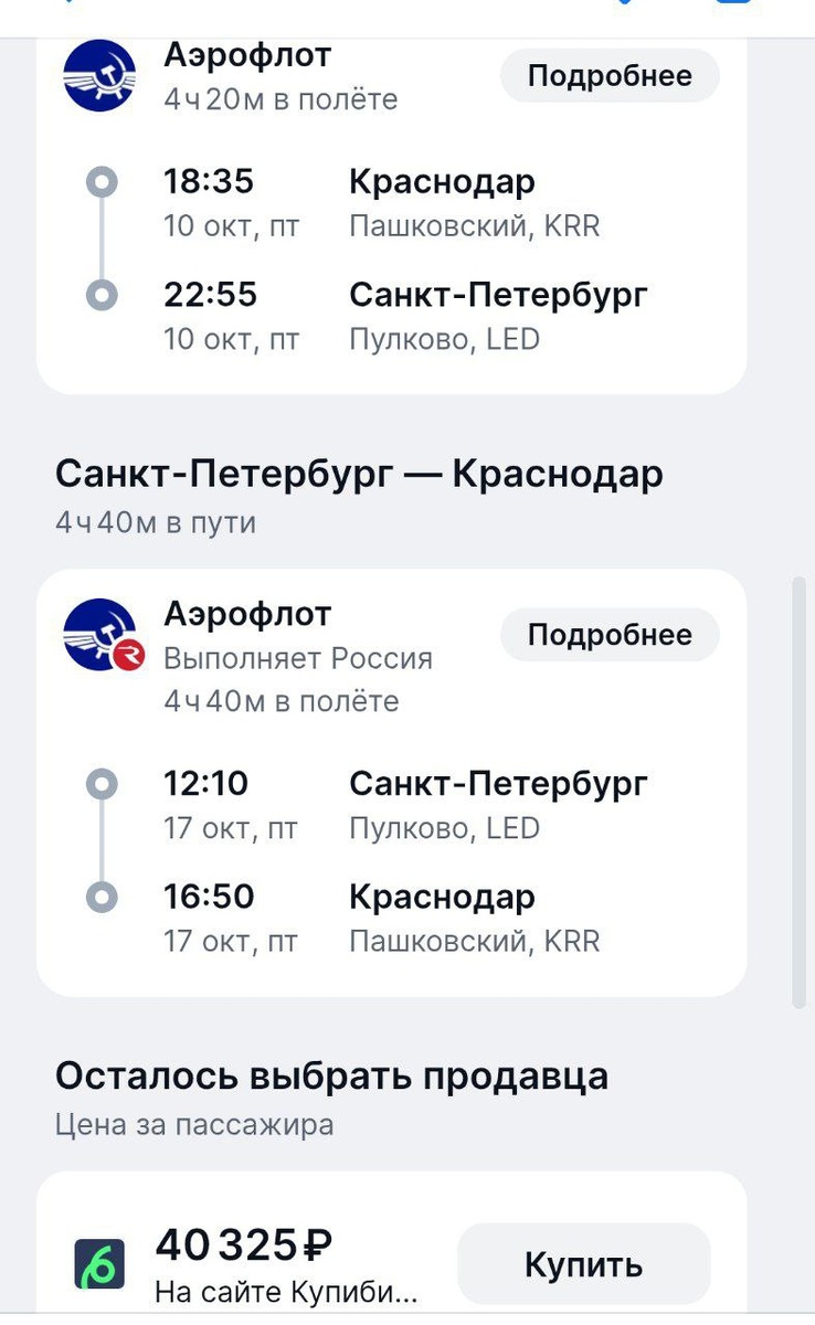 Из Краснодара в Санкт-Петербург будет больше рейсов Авиакомпания «Россия» с 10 октября запускает регулярные полеты по этому направлению. Это дополнительные рейсы к уже существующим ежедневным рейсам «Аэрофлота», что увеличит частоту сообщения между городами и расширит выбор для пассажиров. Новые рейсы SU6316 будут вылетать из Краснодара в 17:50 (с 26 октября — в 18:30) и прибывать в Пулково в 22:15 (с 26 октября — в 23:00). Вылет рейса SU6315 из аэропорта Пулково запланирован в 12:10 (с 26 октября в 12:50), а прилёт в Краснодар - в 16:50 (с 26 октября 17:30). ➡️Слетать туда-обратно можно от 40,3 тыс. руб. @atorus