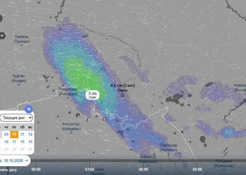 По данным сервиса Ventusky, к концу недели Омскую область ожидает сильное ухудшение погодных условий. В пятницу, 10 октября, область накроет обширное снежное облако, которое принесёт осадки, местами до 3 см снега. По большей части фронт заденет западную часть региона. Омск окажется на его периферии. В городе ожидается около 0,2 см снега, однако в других районах области возможны более интенсивные осадки. Снег будет сопровождаться резким похолоданием. Температура воздуха составит от 0 до +2 градусов. Метеорологи рекомендуют водителям и пешеходам быть осторожными и учитывать ухудшение дорожных условий.