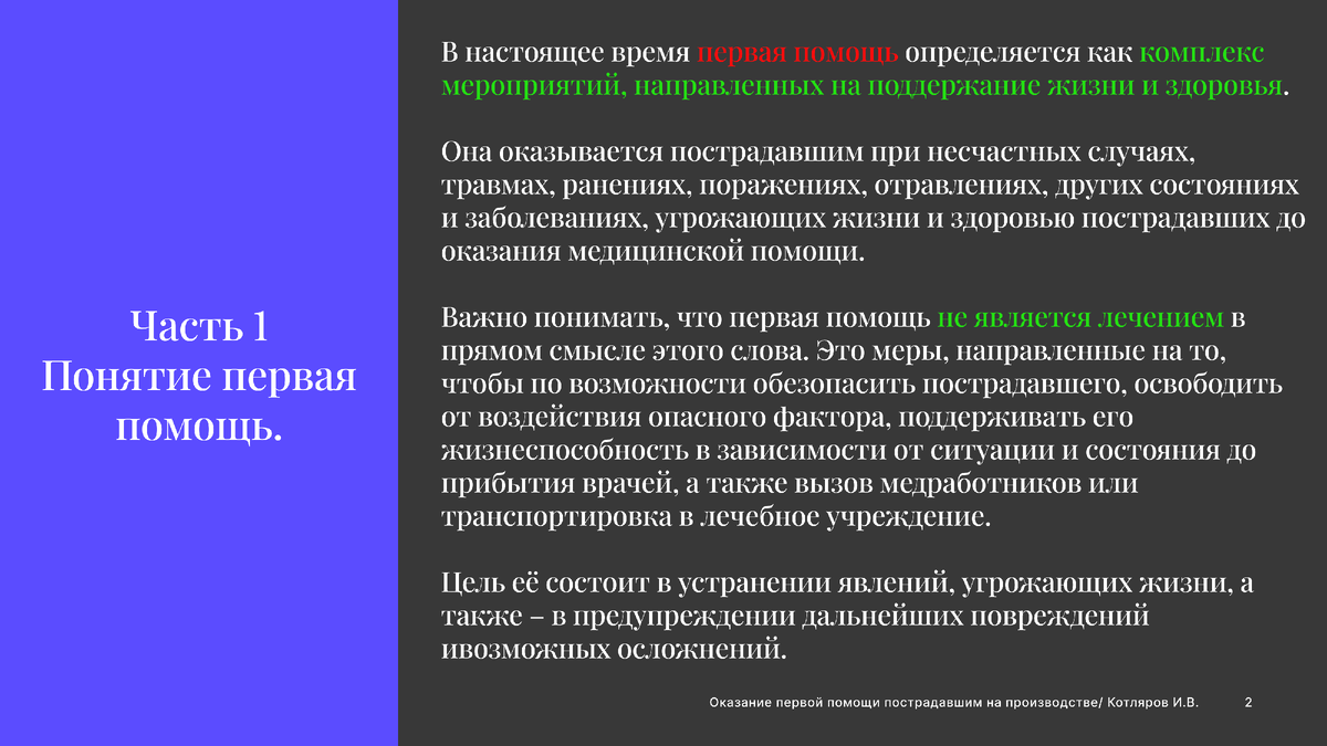 Оказание первой помощи на производстве — это важнейший аспект обеспечения безопасности и охраны труда на предприятии. Руководство компании должно позаботиться о наличии аптечек с необходимыми средствами, а также о том, чтобы все сотрудники прошли обучение по оказанию первой помощи и была организована система оповещения на случай чрезвычайных ситуаций. В случае несчастного случая каждый очевидец или участник должен оценить обстановку, создать безопасные условия для проведения спасательных действий, осмотреть пострадавшего, вызвать бригаду скорой помощи и, при необходимости, провести сердечно-лёгочную реанимацию. После прибытия медицинских работников необходимо продолжить оказание первой помощи, включая остановку кровотечения, обезболивание и иммобилизацию пострадавшего. Важно, чтобы каждый сотрудник знал правила оказания первой помощи и умел применять их на практике. Оказание первой помощи на производстве является важной частью обеспечения безопасности и здоровья работников. На производ