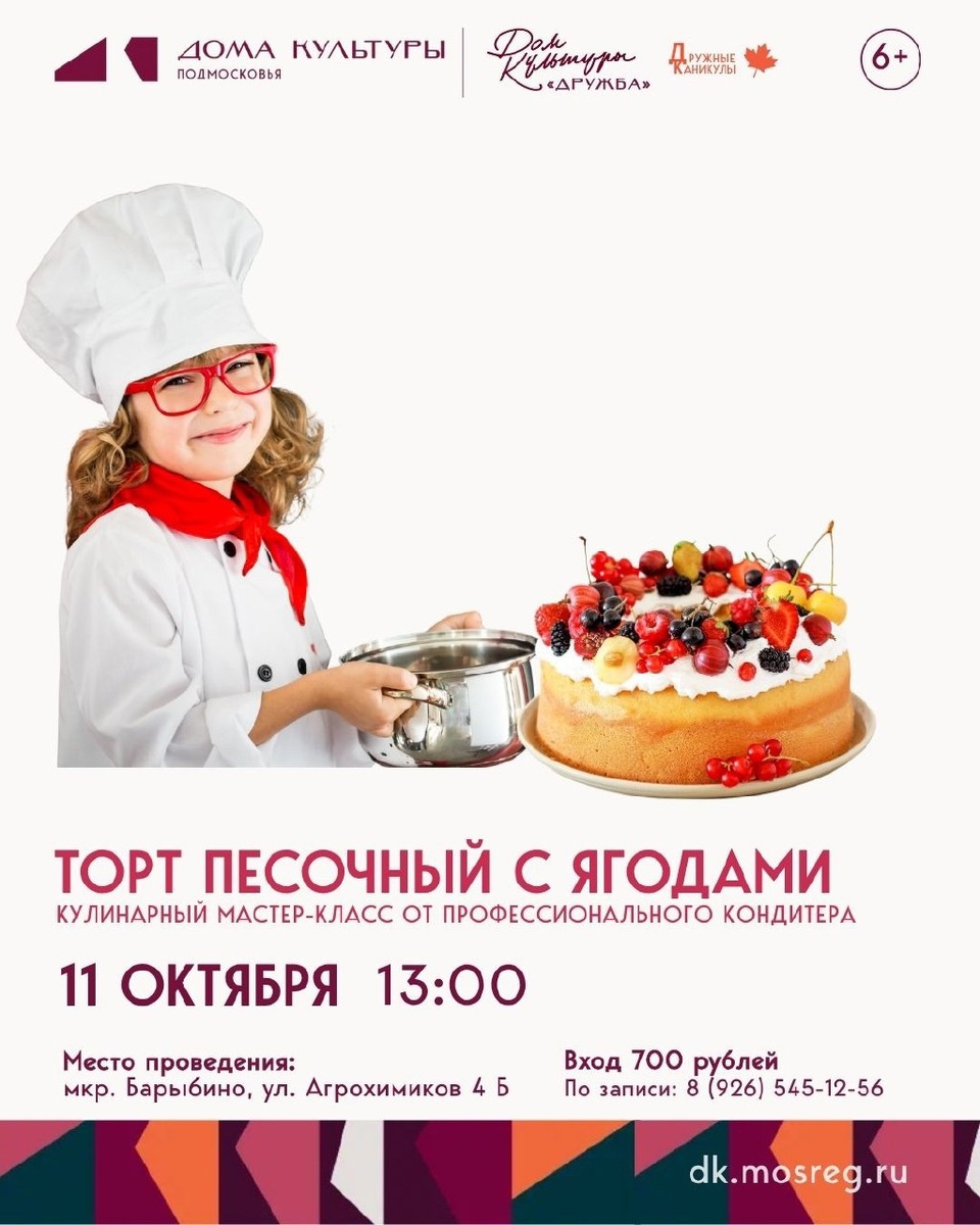 ✨ 🧑🏼🍳 КУЛИНАРНЫЙ МАСТЕР-КЛАСС Уже 🔥 в ЭТУ СУББОТУ!!! Ждем всех желающих 6+ Будем готовить торт с ягодами 😋вместе с профессиональным кондитером Викторией Горьковой. 😍 Пальчики оближешь как вкусно будет! ___________________________________ Скорее записывайтесь 🤗 +7 (926) 545-12-56 Виктория 🚫 Возраст: 6+ 📆 11.10.2025🕒13:00 🏢 Городской дом культуры «Дружба» 📍 г.о. Домодедово, мкрн.Барыбино, улица Агрохимиков, д.4Б 💰 Цена: 700 ₽ ✅ Мероприятия Домодедово https://dzen.ru/id/66f10385cc4c5a16f7b5fb02 http://vk.com/domodedovo_events http://dzen.ru/domodedovo_events
