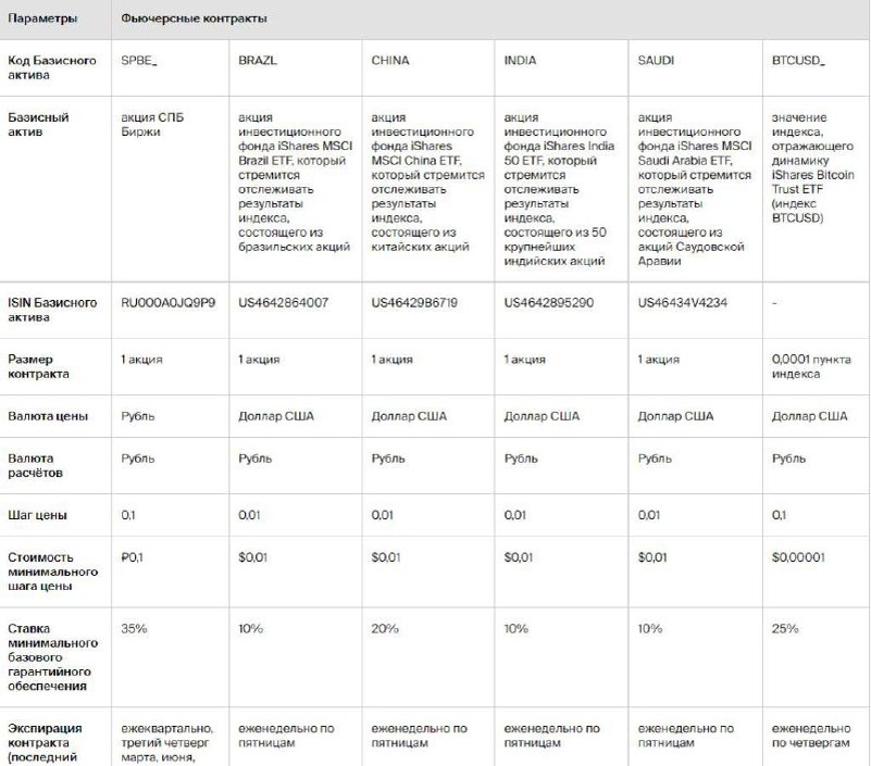 🏦 Срочный рынок на СПБ Бирже 7 октября 2025 года СПБ Биржа официально открыла торги в новой секции «СПБ Фьюче». На начальном этапе инвесторам доступны шесть фьючерсных контрактов: ☑️ Фьючерсы на акции ETF-фондов, которые следуют за страновыми индексами Бразилии, Индии, Китая и Саудовской Аравии. Тикеры – BRAZL201025, INDIA201025, CHINA201025, SAUDI201025. ☑️ Фьючерс на индекс BTCUSD (бенчмарк, который следует за динамикой ETF-фонда iShares Bitcoin Trust). Тикер – ВТСUSD_17J25. Контракт доступен только квалифицированным инвесторам. ☑️ Фьючерс на акции самой СПБ Биржи. Тикер – SPBE_191225. ❗️Вариационная маржа (финансовый результат) по данным контрактам фиксируется по закрытым позициям, поэтому налогооблагаемая база возникает только в момент закрытия. Это отличает данную линейку от любых других фьючерсов на российском рынке. Торги на срочном рынке проводятся ежедневно с 10:00 до 00:00 мск с обязательным присутствием маркетмейкеров для обеспечения ликвидности по каждому контракту.