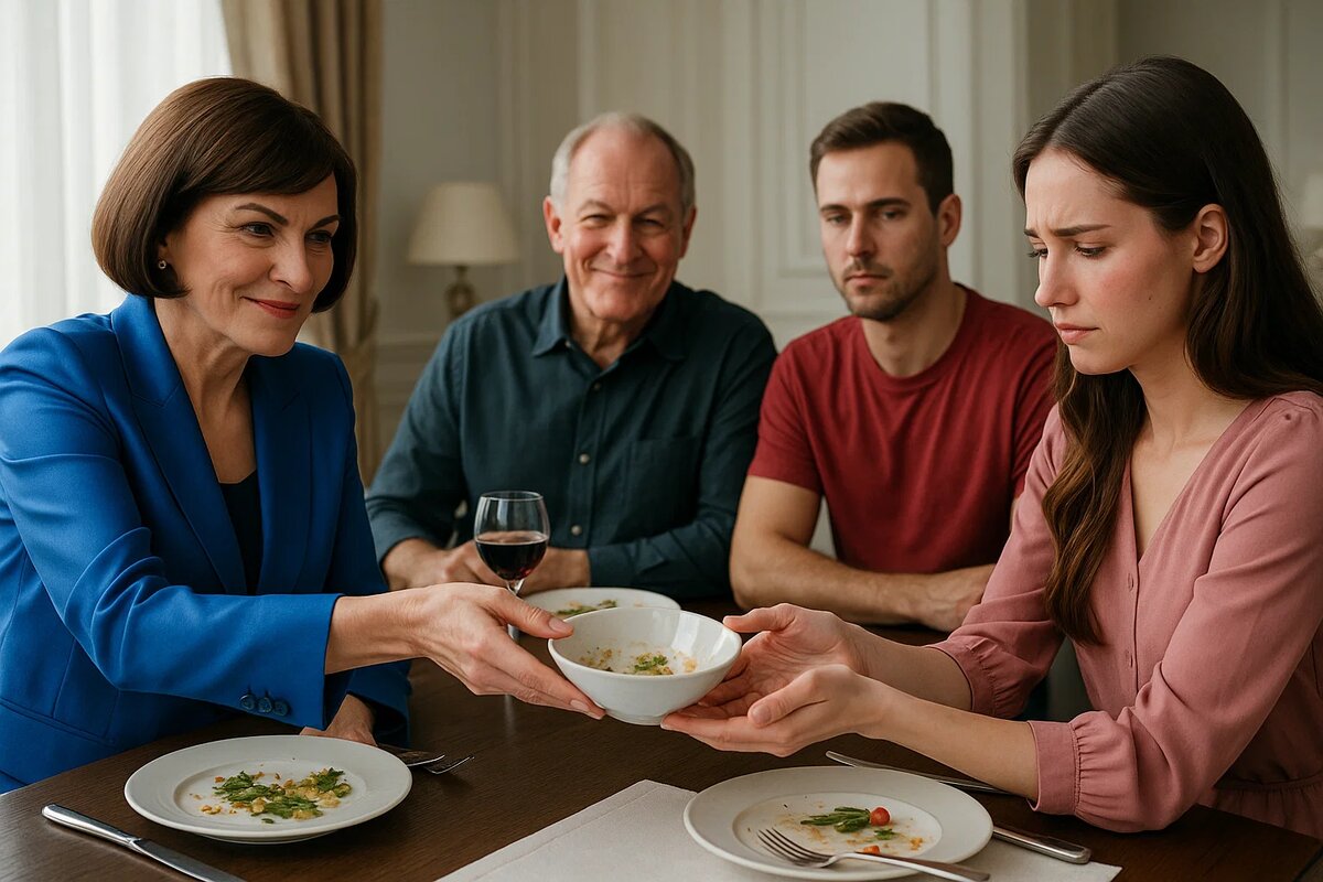 Гости подхватили смех. Лена взяла мисочку, чувствуя, как что-то твёрдое и холодное встало комом в горле.