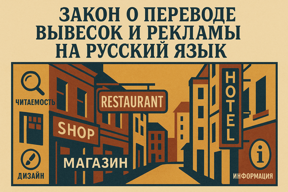 Сразу по делу: в июне 2025-го в России был принят и подписан федеральный закон, прописывающий обязанность делать публичную информацию — вывески, указатели, таблички и значимую рекламную информацию — на русском языке. Формально это — Федеральный закон от 24.06.2025 № 168-ФЗ; ключевые нормы начнут действовать с 1 марта 2026 года. Это серьёзное изменение для бизнеса, девелоперов, ритейла и сервисной сферы: привычные «Sale», «Open», латинские названия ЖК и витрина с иностранными надписями потребуют адаптации и/или дубляжа кириллическим текстом.