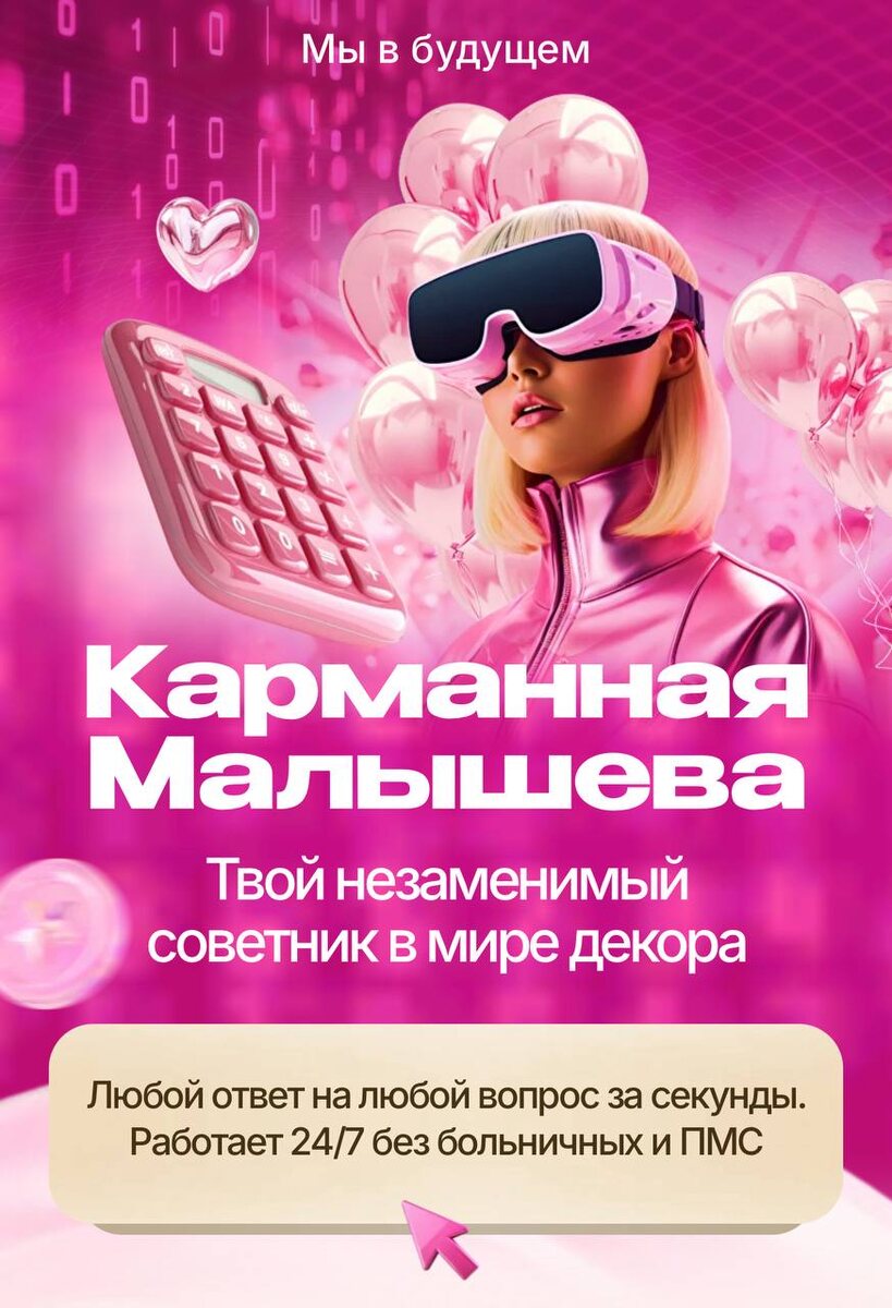 Давай с нами в космическое будущее , где на тебя работает нейросеть, экономя тебе время и деньги на дорогих сотрудников. 🔥КАРМАННАЯ МАЛЫШЕВА 🔥 Прямо сейчас эта неутомимая помощница декораторов строчит посты, считает сметы , составляет контент - планы и даже пишет сочинения за детей . Лучшая подружка декораторов - Карманная Малышева А сейчас и по такой доступной цене 😱 2990р за 100 диалогов ♥️ Скорее нанимай её на работу и загружай её задачами с утра и до ночи 💵 пусть она работает, а ты в это время будешь масштабировать свою студию декора (она, кстати , поможет и с этим))♥️ Скорее читай на сайте весь функционал и отдай ей всю рутину https://schooldecoronline.ru/kmalysheva