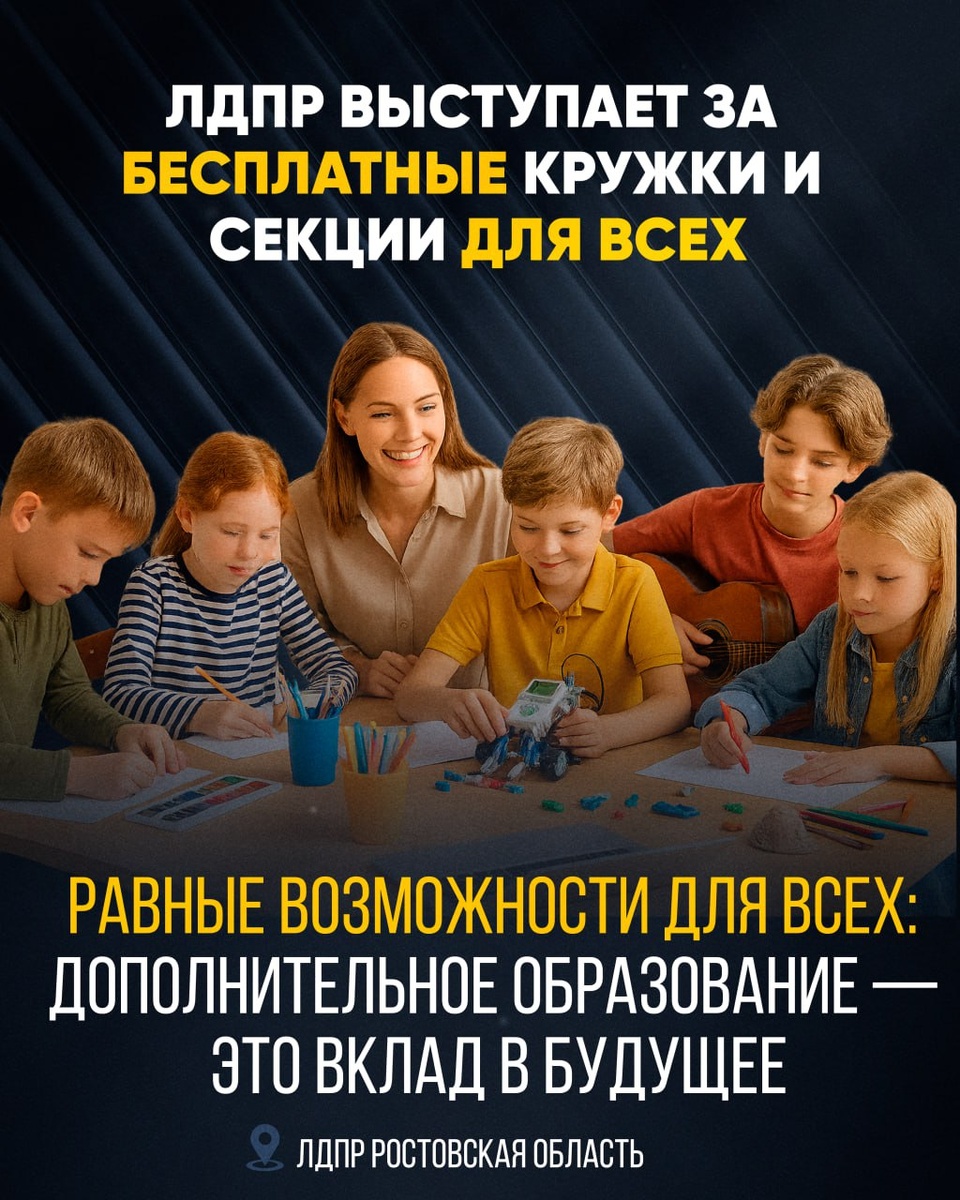 Леонид Слуцкий предложил закрепить федеральные гарантии бесплатных кружков для детей 🔝 Председатель ЛДПР Леонид Слуцкий предложил закрепить на федеральном уровне гарантию бесплатного дополнительного образования для детей — кружков, секций и творческих студий. По его словам, эта мера позволит создать равные условия для развития школьников во всех регионах России, вне зависимости от дохода семьи и места проживания. ✅ Он отметил, что сегодня возможности детей в получении дополнительного образования сильно различаются даже внутри одного региона. В одних школах кружки и секции доступны бесплатно или за символическую плату, а в других — полностью отсутствуют или стоят слишком дорого. Такое положение, по мнению лидера ЛДПР, недопустимо: талант ребёнка не должен зависеть от материального положения семьи. Государство обязано гарантировать равные возможности каждому школьнику. ✅ Для Ростовской области этот вопрос особенно актуален. В крупных городах — Ростове-на-Дону, Волгодонске, Таганроге,