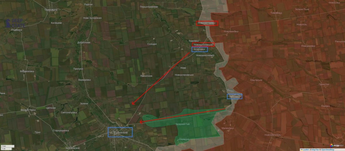 За последние два дня ГВ «Восток» на южной части своей полосы наступления перешла к выполнению ключевой на данный момент задачи: переходу через реку Янчул, что я прогнозировал в одном из прошлых обзоров. На самом краю село Полтавка даже по Дипстейту в «серой зоне» почти полностью, а выше ВС РФ взяли Новогригоровку и Нововасилевское с очевидной целью штурма Успеновки. Полтавку, думаю, можно уже считать для ВСУ потерянной, а вот в Успеновки украинская армия может быть и сможет удерживать фронт, а может и нет, узнаем в ближайшие дни. Переход Янчула на этой полосе шириной в 10 километров позволяет далее развивать наступление как раз по двум дорогам к Гуляйполю с достаточно быстрым выходом к его северным окраинам. А это, в свою очередь, позволит отрезать рокаду на север в Покровское, оставив одну дорогу снабжения, которая и так должна контролироваться с юга. От позиций ВС РФ до неё менее 10 километров. Потенциально это позволяет начать бои за Гуляйполе — родину и место боевой славы Нестор